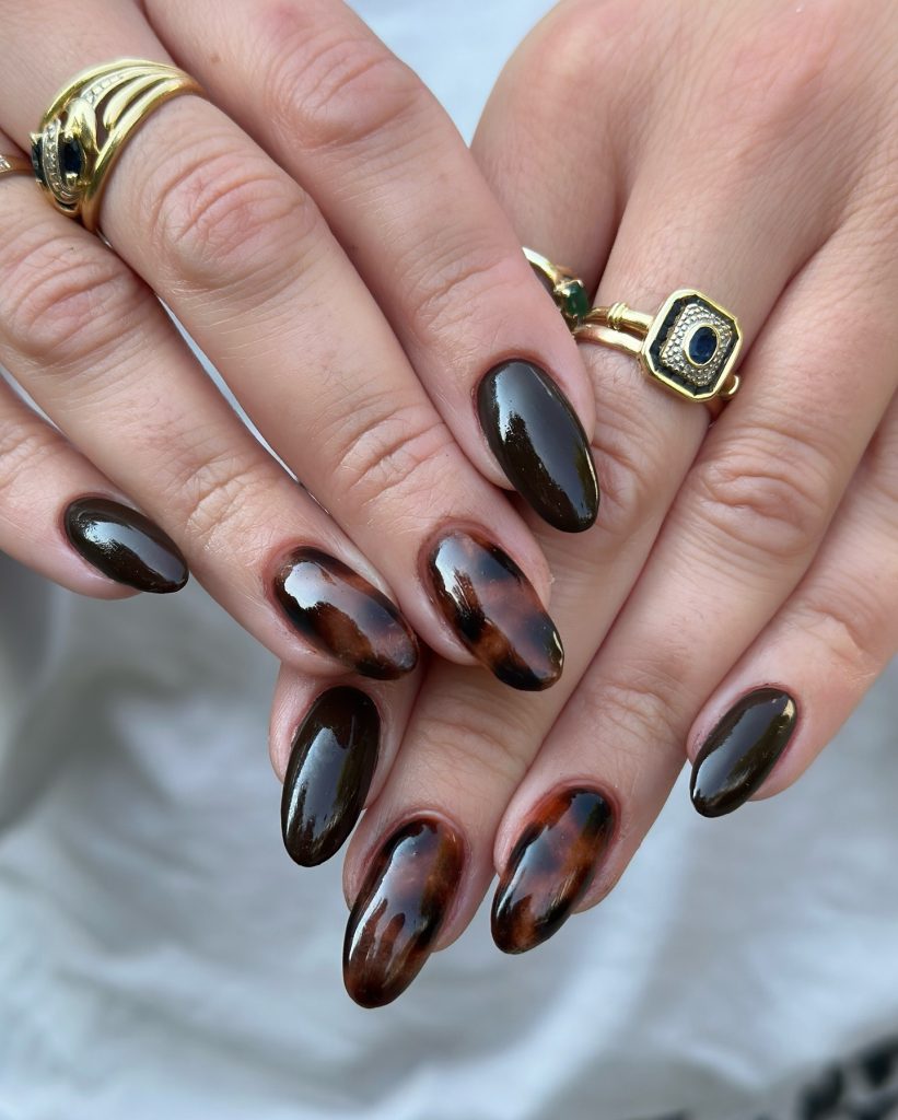 Algunas uñas tienen el diseño de carey, mientras que otras se pintan con esmaltes sólidos en tonos marrones claros y oscuros. Es una opción cálida y sofisticada, ideal para otoño.