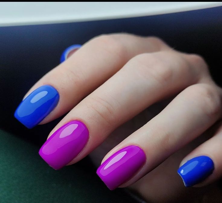 Aplica azul en todas las uñas de una mano y fucsia en la otra mano para un contraste audaz y llamativo.