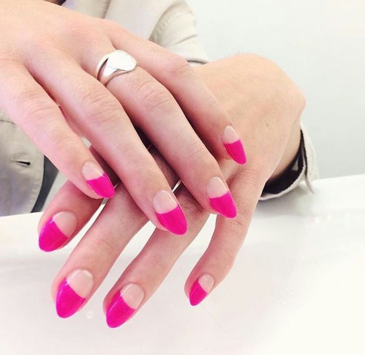 Aplica el esmalte blanco en la base de la uña y luego pinta la punta con esmalte fucsia. Este estilo es una variación moderna de la clásica manicura francesa.