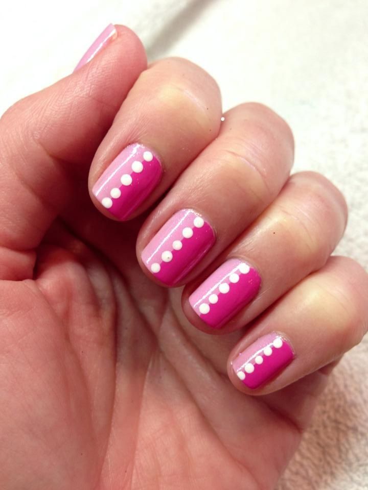Pinta todas las uñas con esmalte fucsia y luego agrega lunares blancos en diferentes tamaños utilizando un punzón o un pincel fino. Este diseño es divertido y juguetón.