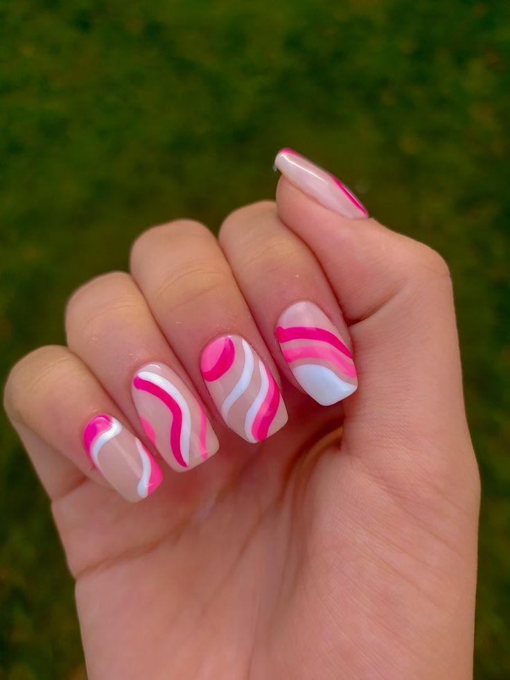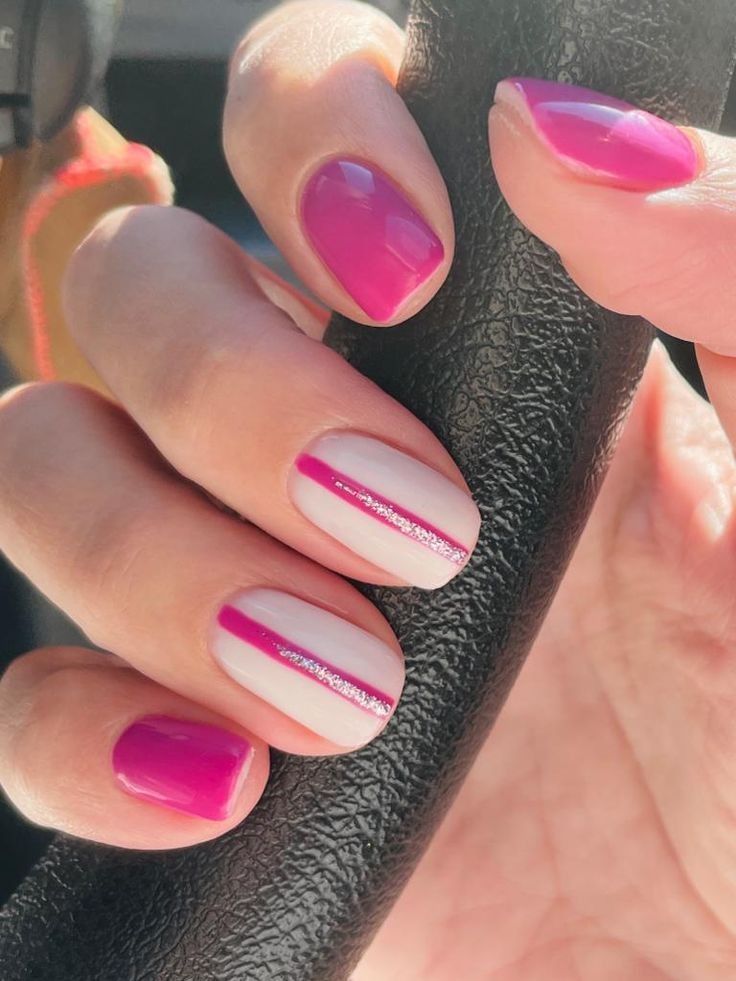 Pinta la uña con esmalte fucsia y luego agrega líneas verticales blancas con un pincel fino o un rotulador de nail art. Este diseño es simple pero elegante.