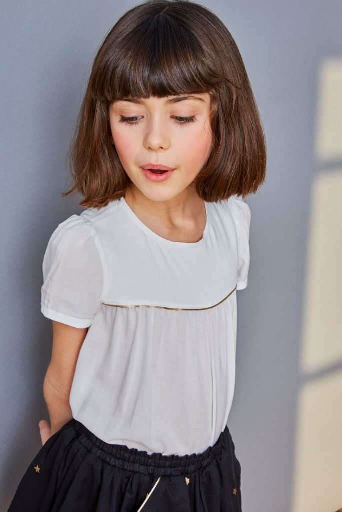 Un flequillo completo puede ser una opción encantadora y juvenil para niñas con frentes más amplias.