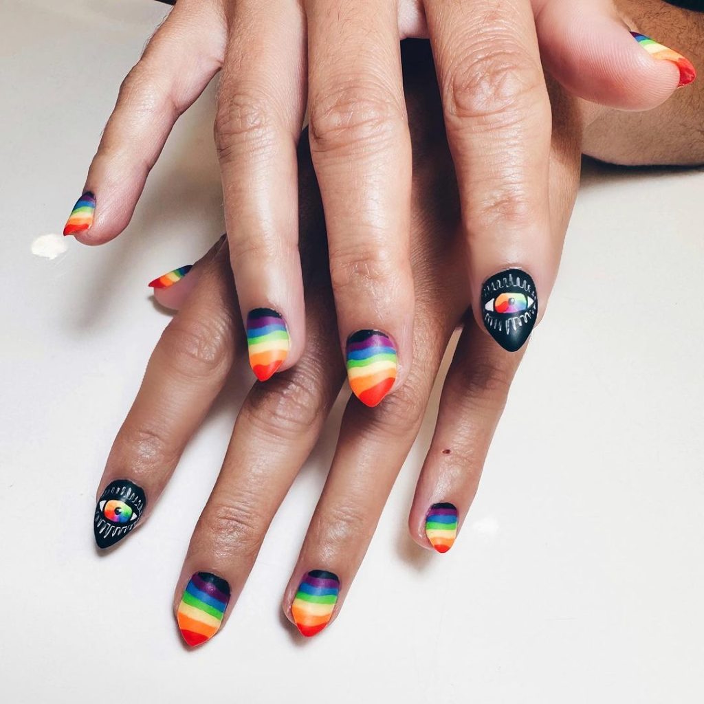 Si buscas una verdadera obra de arte, esta manicura para el Orgullo es para ti. La bandera hecha con esa especie de ondas que dibujan como aguas, es preciosa. Y eso por no hablar de ese simbólico y místico ojo que todo lo ve… Lo místico está de moda e integrarlo con esta manicura para el Orgullo puede ser genial si ambas ideologías forman parte de ti.
