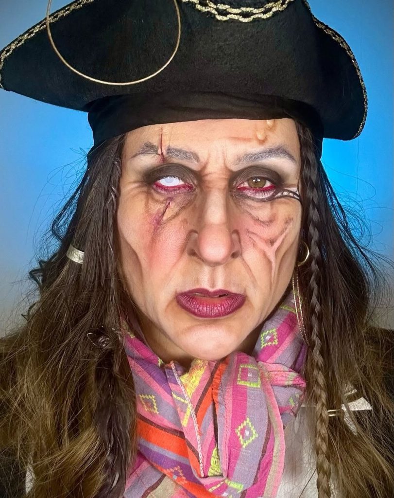 Hay que tener en cuenta que esta inspiración es para personas muy capaces y creativas. Sin embargo, lo más importante del maquillaje de pirata es conseguir un parche que complemente el look completo y destacar los ojos y los labios como en este caso. Céntrate en conseguir un aspecto siniestro y, si las arrugas son demasiado para ti, olvida estos pequeños detalles que pueden no estar presentes sin que por ello dejen de conseguirse muy buenos resultados.