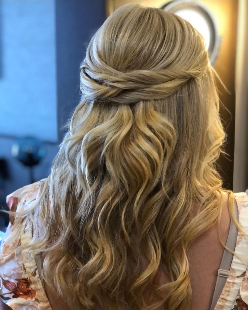 Un medio recogido puede ser ideal y una de las mejores opciones entre los peinados para una boda de día que puedes escoger. Si esta opción se puede quedar corta en una boda de noche, para el día es elegante y sofisticada. Si eres de las que suele llevar un look casual y has elegido un vestido de corte romántico o con un toque boho chic, ¡este peinado le irá genial! Y es que en un evento como una boda, lo mejor es apostar por un total look en lugar de experimentar para evitar sentirte después incómoda por haber elegido un estilo demasiado atrevido y robarle protagonismo a la novia. Se puede brillar sin destacar demasiado…