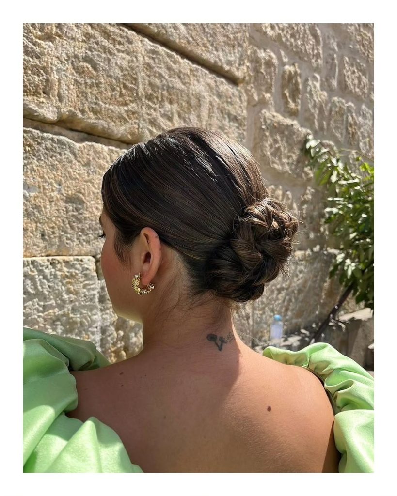 Un moño bajo como este es una buena idea si llevas la espalda al aire o te apetece elegir un recogido clásico e infalible. Una de las mayores ventajas que tiene este tipo de moño, además de que es casual y sofisticado al mismo tiempo, es que se puede lograr con diferentes longitudes de pelo. Tanto si llevas media melena como si llevas el pelo largo. Obviamente, cuanto más larga sea tu melena, más fácil será que este moño agarre bien y que no queden mechones fuera, En el caso de que tu pelo sea más corto, se puede recurrir a fijadores o laca.