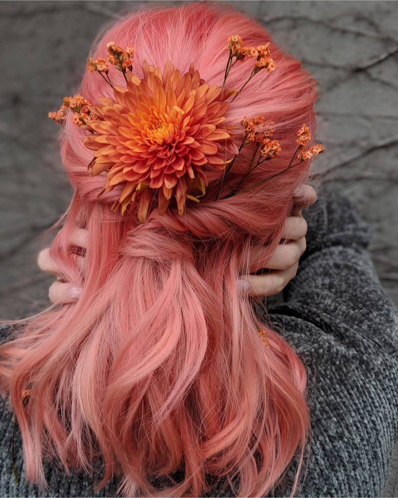 Un peinado como este, inspirado en la bruja buena, con todo el color rosado de esas buenas intenciones y es magia blanca y motivos del lado femenino de la naturaleza como la flor que lo acompaña puede ser genial… También tiene un toque muy artístico que puede hacerte sentir única…