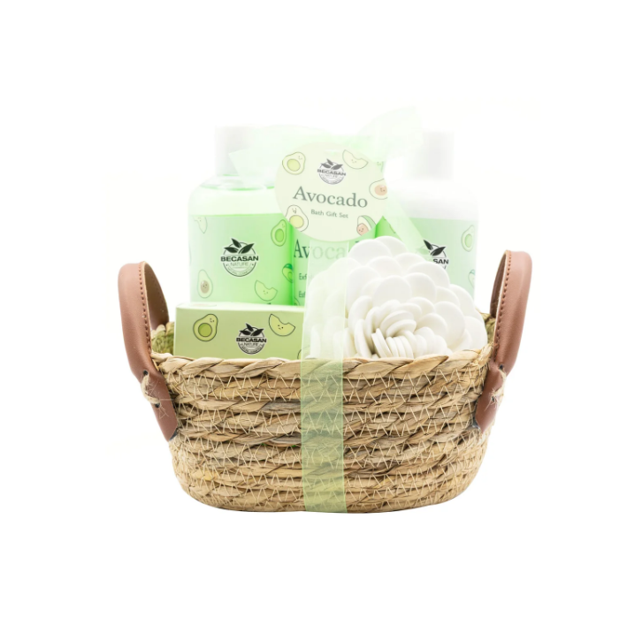 La Cesta de Mimbre Delicias de Aguacate de BECASAN NATURE incluye un gel corporal para ducha o baño, una loción corporal hidratante perfumada, un exfoliante corporal, sales de baño y una esponja EVA con forma de flor. Esta cesta de regalo permite combinar limpieza, hidratación y cuidado de la piel en un solo conjunto, facilitando una rutina corporal completa.