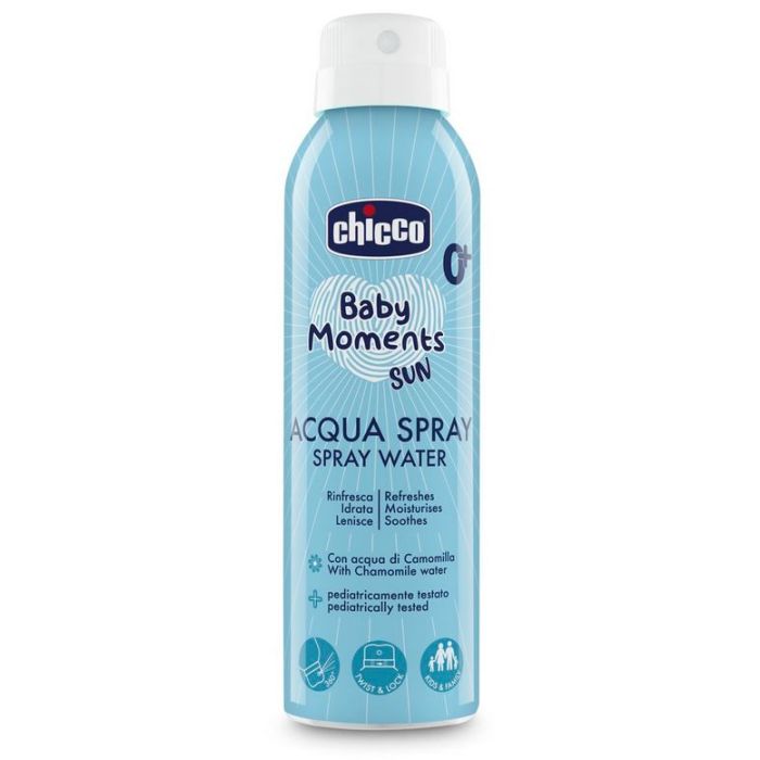 El Baby Moments Sun Spray Water de CHICCO es un producto ideal para hidratar, refrescar y calmar todo tipo de piel, especialmente la piel delicada del bebé.