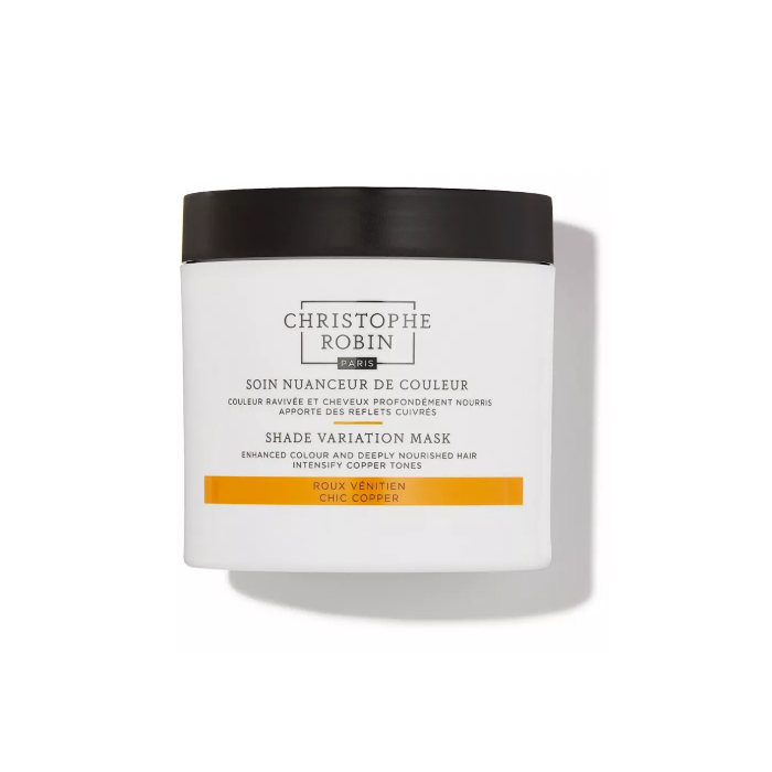 La CHRISTOPHE ROBIN Shade Variation Mask Mascarilla Capilar Chic Copper reestructura el cabello y revitaliza los tonos cobrizos, gracias a su fórmula enriquecida con manteca de almendra y aceite de buriti.