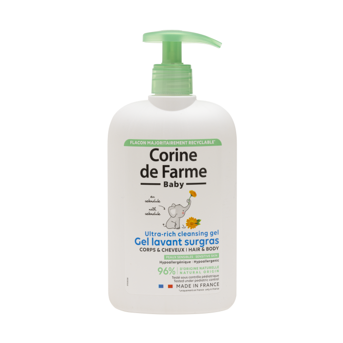 Limpia suavemente la piel y el cabello del bebé calmando e hidratándolos.