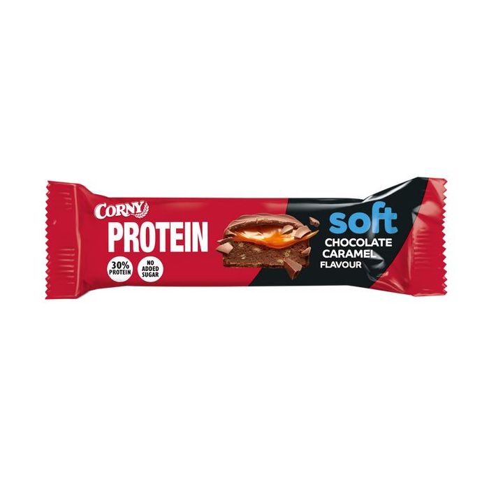 Las barritas Corny Protein soft de chocolate tienen una textura suave, con un sabroso y generoso relleno de caramelo recubierto con una cobertura de chocolate.