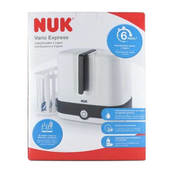 NUK Esterilizador Vaho Vario Express tiene capacidad para 6 biberones NUK FirstChoice y accesorios.