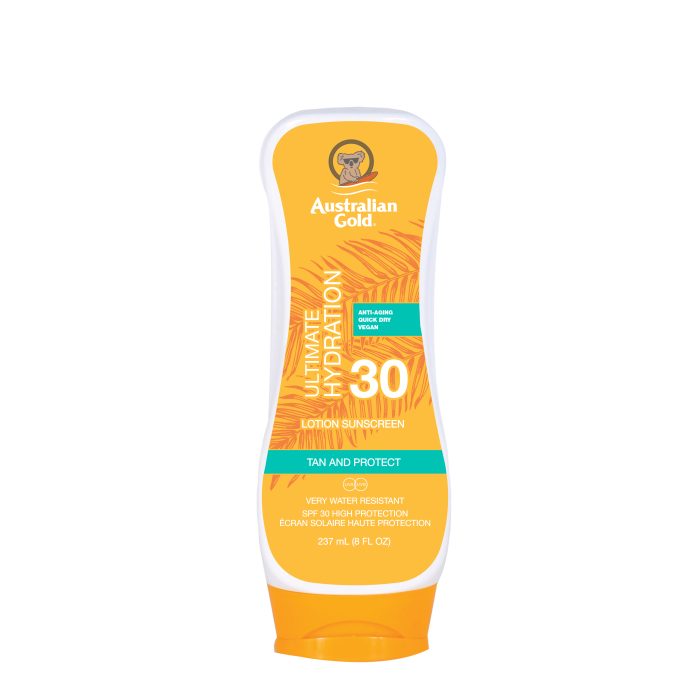 Sunscreen Lotion de Australian Gold, con diversos niveles de protección SPF 15, 30 y 50, protege perfectamente la piel contra los rayos UVA y UVB a la vez que proporciona un color bronceado inmediato y dorado.