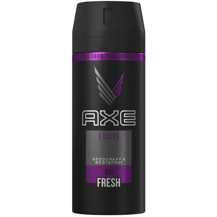 Desodorante Excite de Axe: Es un desodorante en formato spray que evita el mal olor de tus axilas con una agradable y fresca fragancia. Es antitranspirante y especialmente creado para hombres, con un aroma con notas de caramelo que emocionarán a cualquiera y el dulce tinte de avellana y coco te convertirá en un verdadero objeto de lujuria y seducción.