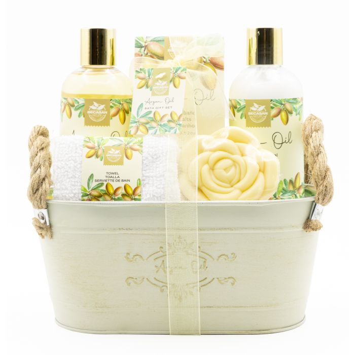 BECASAN te presenta la BECASAN Cesta de Baño Metálica Argán, una excelente cesta metálica con productos de baño diseñada para ofrecerte una experiencia completa de cuidado personal.