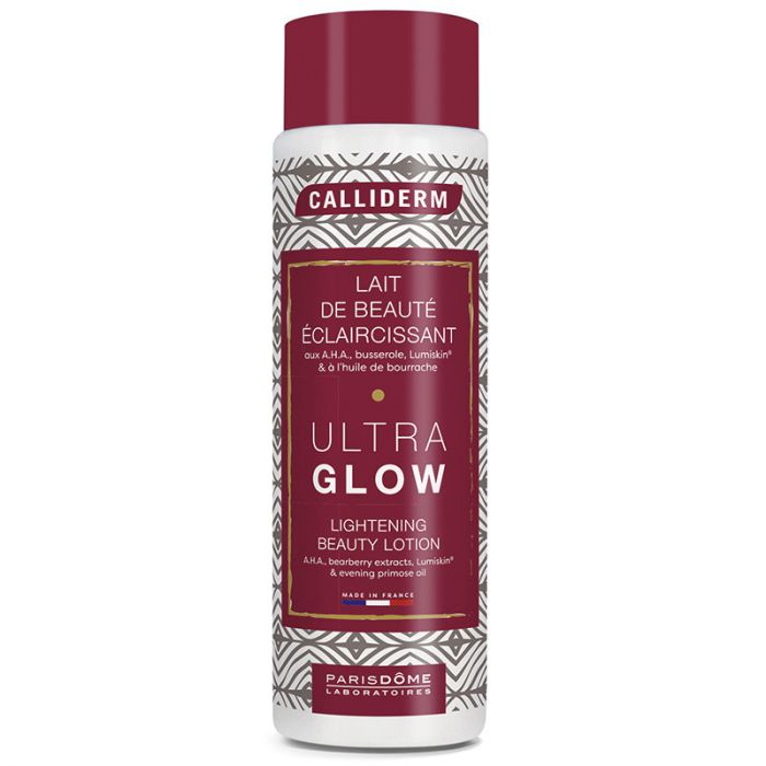 La leche iluminadora Ultra Glow de Calliderm pertenece a una gama creada especialmente para el cuidado de la piel negra y mestiza. Aclara visiblemente la piel de manera prograsiva tras su uso diario. Su fórmula es rica en el aclarante triactivo L.A.B. (4,2%), extractos de A.H.A y gayuba hidrata profundamente de manera intensa y duradera. Además, el aceite de borraja de su composición, hidrata, protege y suaviza tras su aplicación.