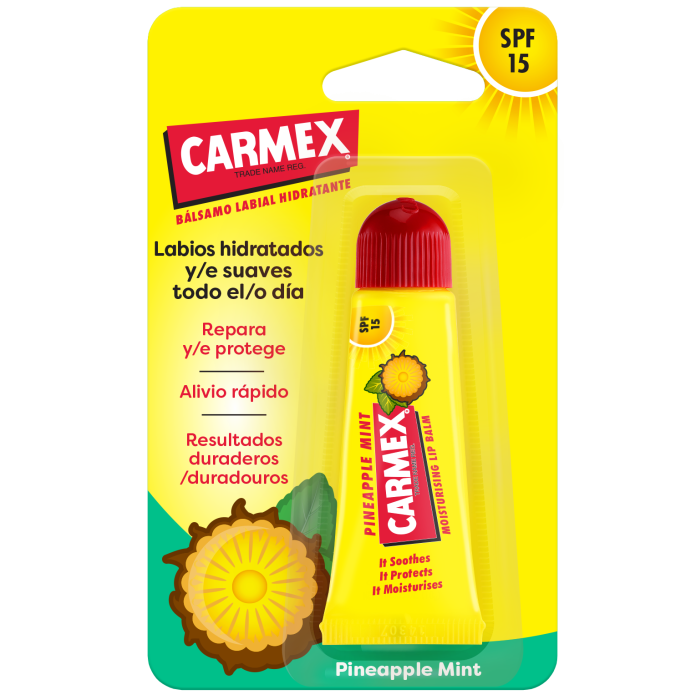 La fórmula de Bálsamo Labial Piña y Menta SPF15 está pensada para suavizar, calmar y favorecer la recuperación de labios resecos o agrietados. Además, CARMEX incorpora un factor de protección SPF15 que ayuda a prevenir molestias generadas por la exposición solar, reforzando la utilidad diaria de Bálsamo Labial Piña y Menta SPF15.