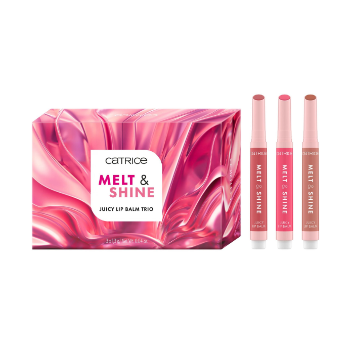 El Trio Bálsamos Labiales Melt & Shine de CATRICE incluye tres tonos: rojo cálido, coral rosado y marrón suave. Con una textura que se funde fácilmente, el Trio Bálsamos Labiales Melt & Shine de CATRICE ofrece un acabado brillante tipo espejo y facilita su aplicación gracias a su formato de clic.
