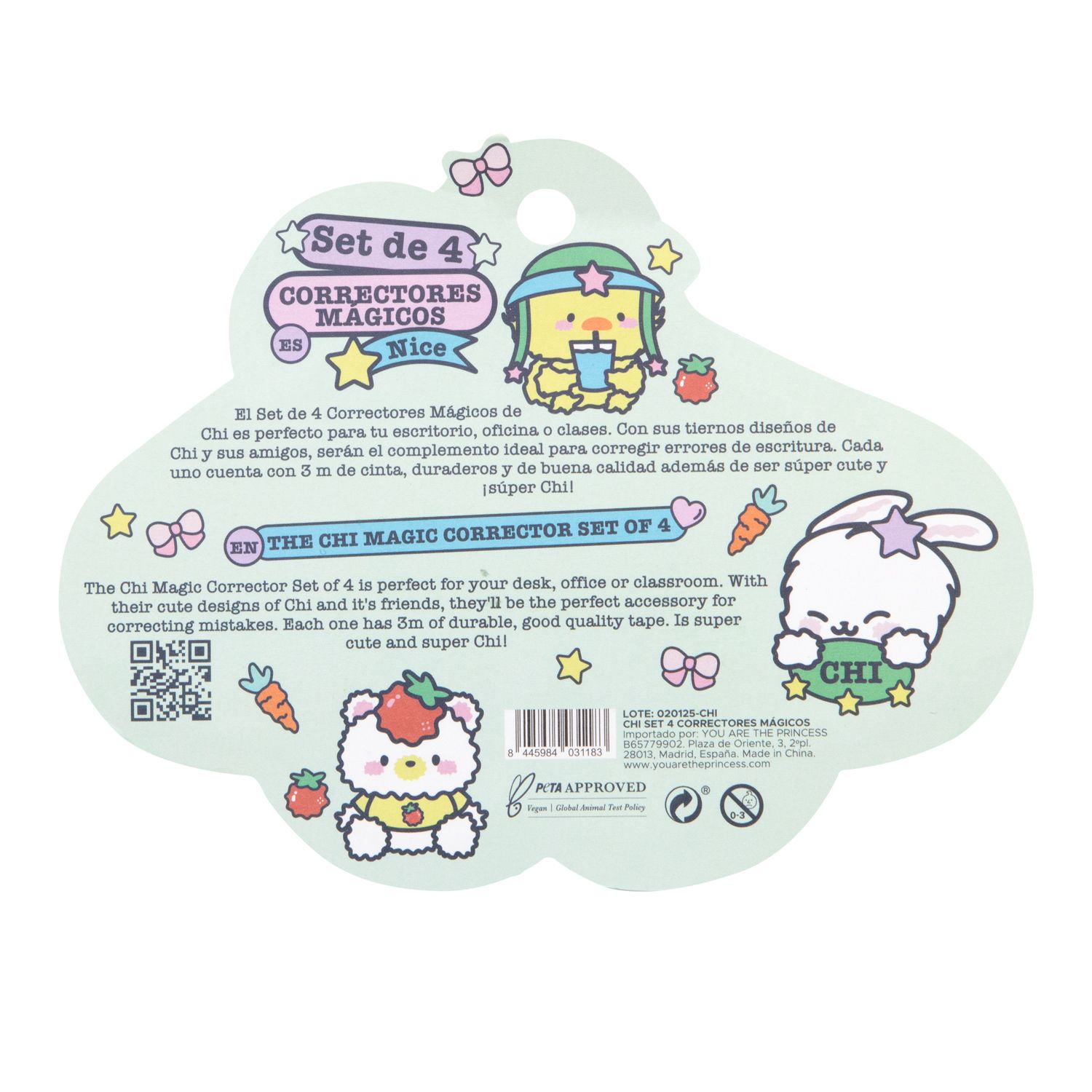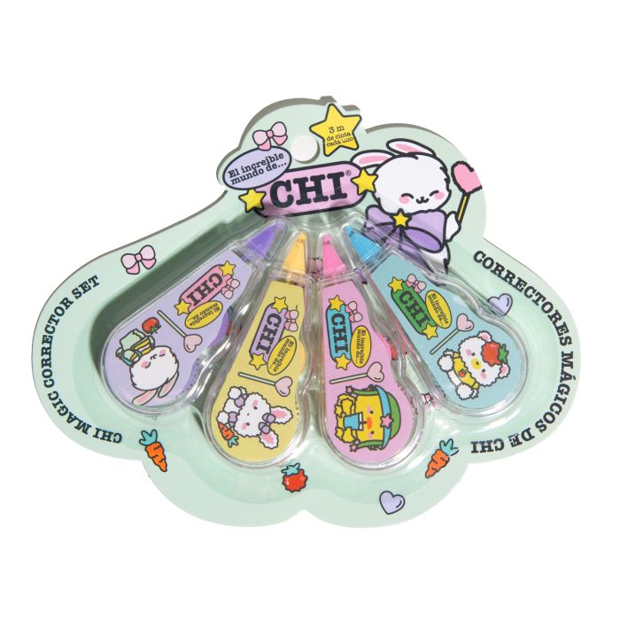 Este Set 4 Correctores Mágicos de Escritura incluye cuatro unidades con diseños inspirados en CHI y sus personajes. Cada corrector ofrece 3 metros de cinta, lo que permite realizar múltiples correcciones de forma limpia y precisa.