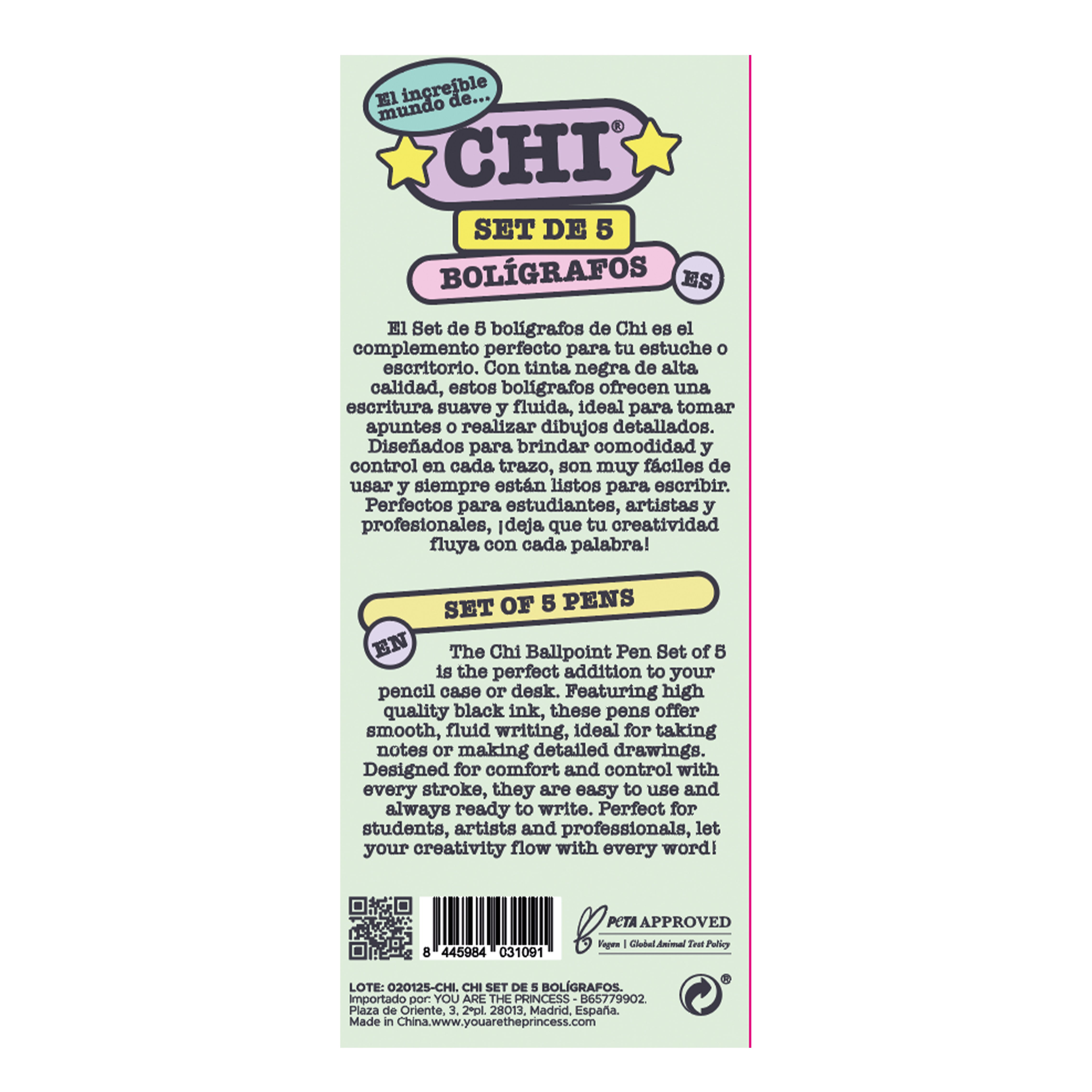 El Set de 5 bolígrafos de Chi es el complemento perfecto para tu estuche o escritorio. Con tinta negra de alta calidad, estos bolígrafos ofrecen una escritura suave y fluida, ideal para tomar apuntes o realizar dibujos detallados.