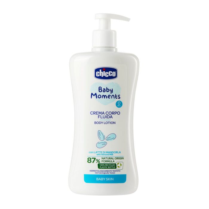 Utiliza CHICCO Baby Moments Crema Corporal Fluida para mantener la piel de tu bebé siempre suave y sedosa, confiando en la calidad de CHICCO para el cuidado diario de tu pequeño.