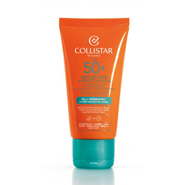 La Crema Solar Para El Rostro Protección Activa de Collistar SPF50+ es ideal para pieles sensibles, además previene de las manchas solares y de las arrugas. No deja marcas en la piel.