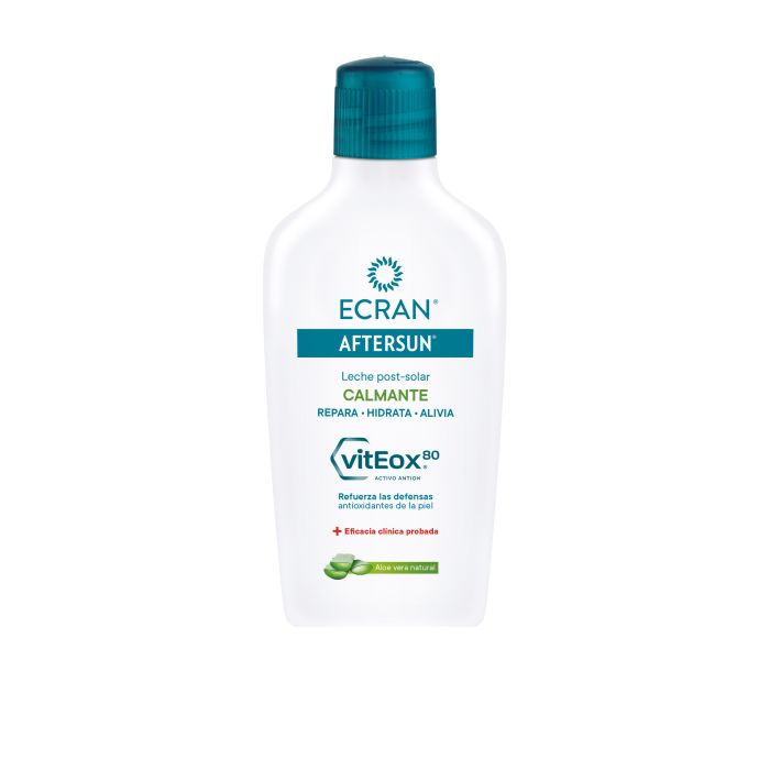 Aftersun Leche Calmante Hidratante Aloe Vera de Ecran es una leche post-solar enriquecida con aloe vera natural que hidrata durante 24 horas y mantiene el bronceado por más tiempo.