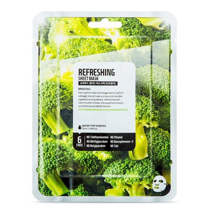 Máscara Refrescante de Brócoli Farmskin. Contiene las vitaminas y minerales del brócoli, con efectos nutritivos y refrescantes para el rostro, con ingredientes 100% vegetales.