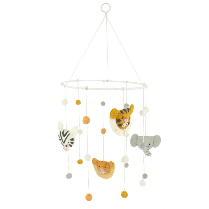Enamórate de nuestro móvil Safari. Con pompones en tonos mostaza gris y blanco y cuatro minifiguras (elefante, tigre, león y cebra) de fieltro.