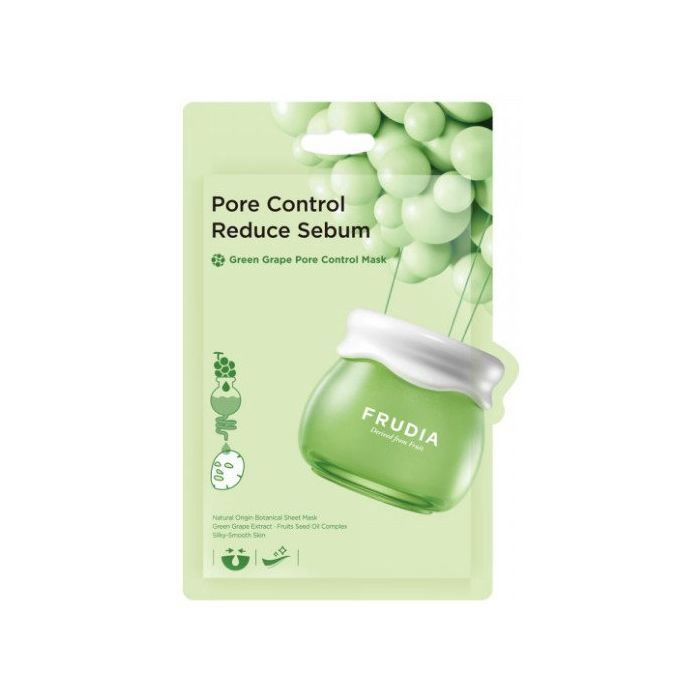 FRUDIA Mascarilla Control de Poros con Extracto de Uva contiene extracto de uva verde (60%). Se adhiere muy bien al rostro, está hecha de fibras de plantas de origen natural que no dañan la piel.