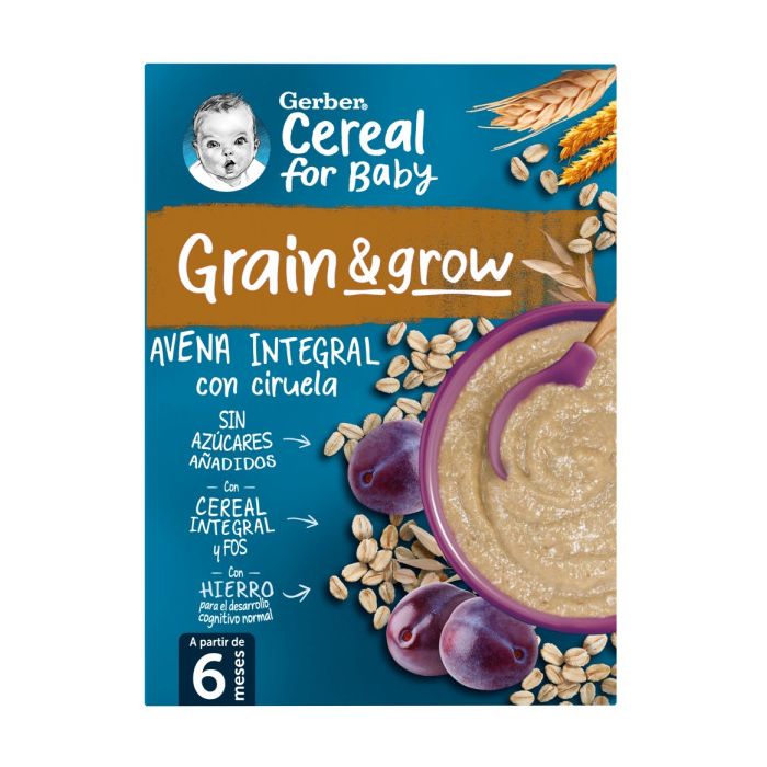 GERBER Papilla Avena Integral con Ciruela con cereales que provienen de cultivos exclusivos en cereales para bebés y siguiendo prácticas sostenibles.