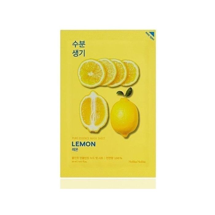 Holika Holika Pure Essence Mascarilla Iluminadora Limón,enriquecida con extracto de limón que le aporta  vitamina C, restaurando la elasticidad y el brillo natural de la piel, la refresca, la hidrata y la llena de vitaminas. Además, si se usa con regularidad suaviza y mejora la textura de la piel por el ligero efecto exfoliante de los ácidos de frutas que contiene.