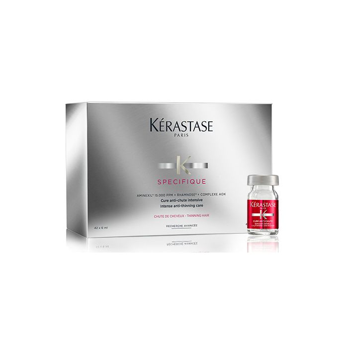 Kérastase Tratamiento Anticaída Aminexil Force reduce la caída del cabello y su afinamiento en tan solo 6 semanas. Este tratamiento intensivo clínicamente probado ayuda a reducir la pérdida de capilares, brindando mayor resistencia a la tracción capilar y menor rotura durante el peinado. Su uso continuado refuerza tu pelo, recuperando el volumen y la flexibilidad. El resultado es una melena sedosa y sin grasa en las raíces.