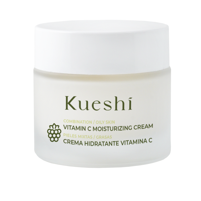 KUESHI Crema de Día Vitamina C y Extractos de Fruta, una crema de día que calma y combate las imperfecciones de la piel gracias a los extractos de té verde y tomillo ecológicos.