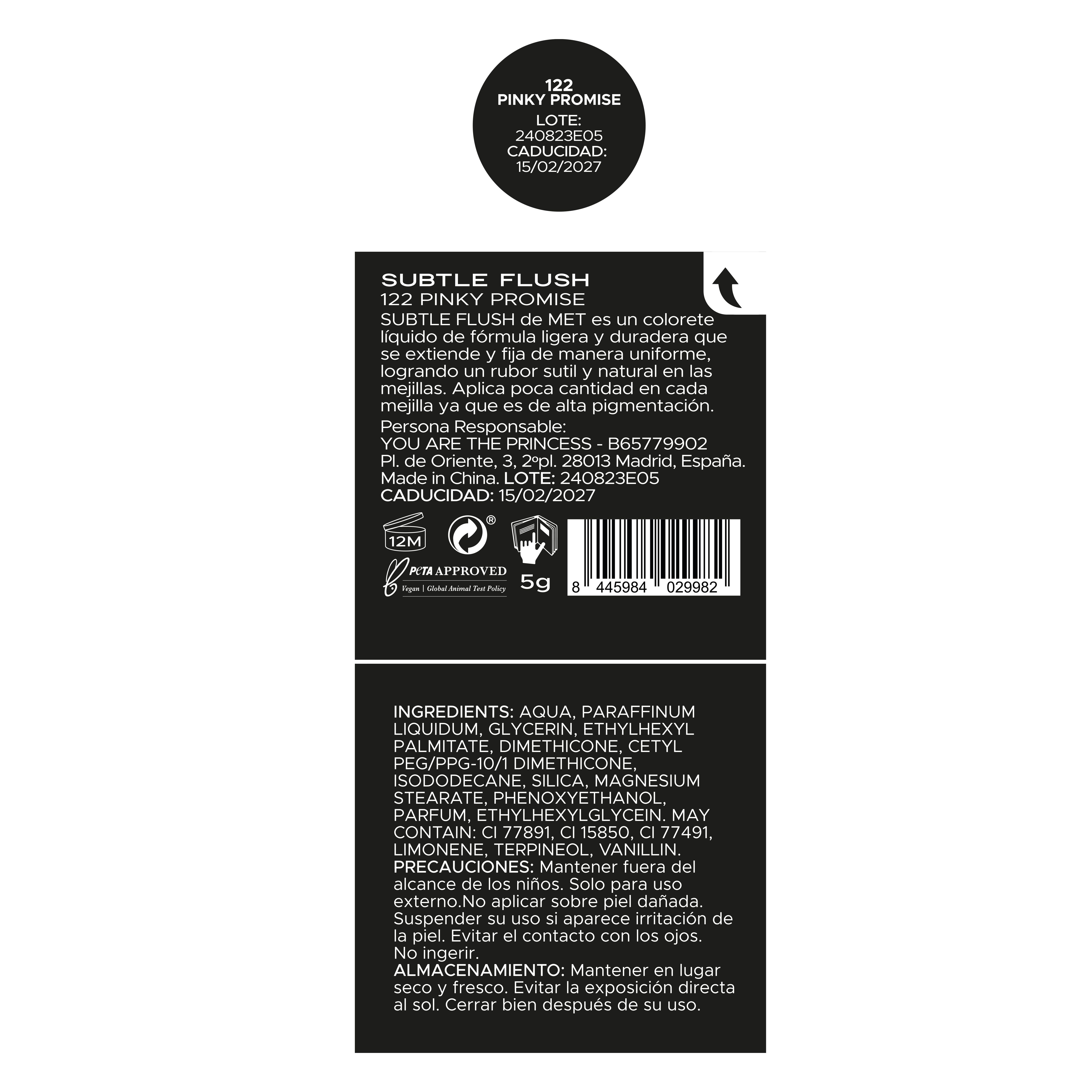 SUBTLE FLUSH de MET es un colorete líquido de fórmula ligera y duradera que se extiende y fija de manera uniforme, logrando un rubor sutil y natural en las mejillas. Aplica poca cantidad en cada mejilla ya que es de alta pigmentación.