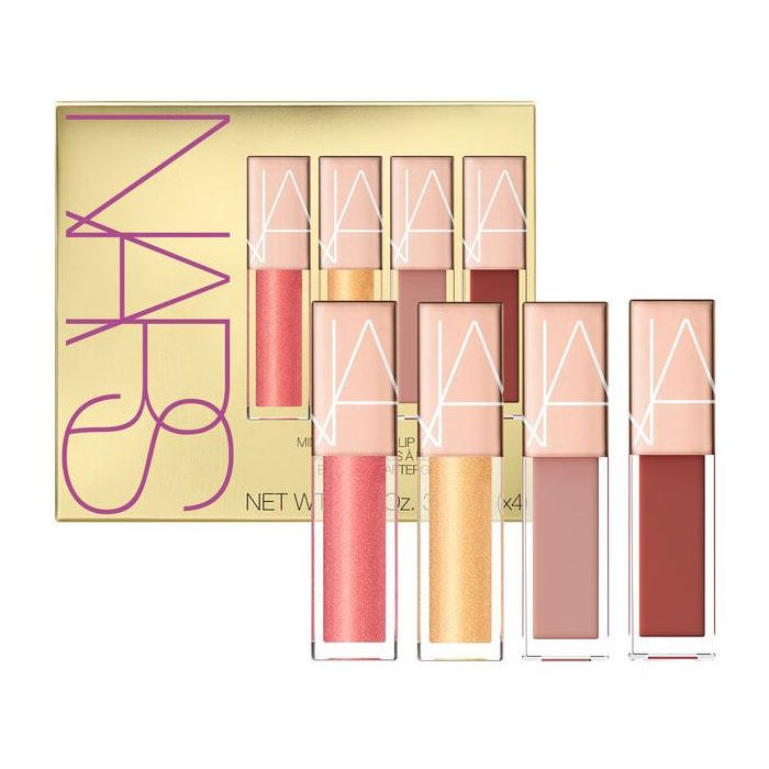 El NARS Mini Set de Brillo Labial Afterglow incluye cuatro tonos que se adaptan a diferentes estilos, entre los que se encuentran el rosa melocotón Orgasm, el dorado brillante A-Lister, el gris topo frío Nympho y el castaño rojizo Aragón.