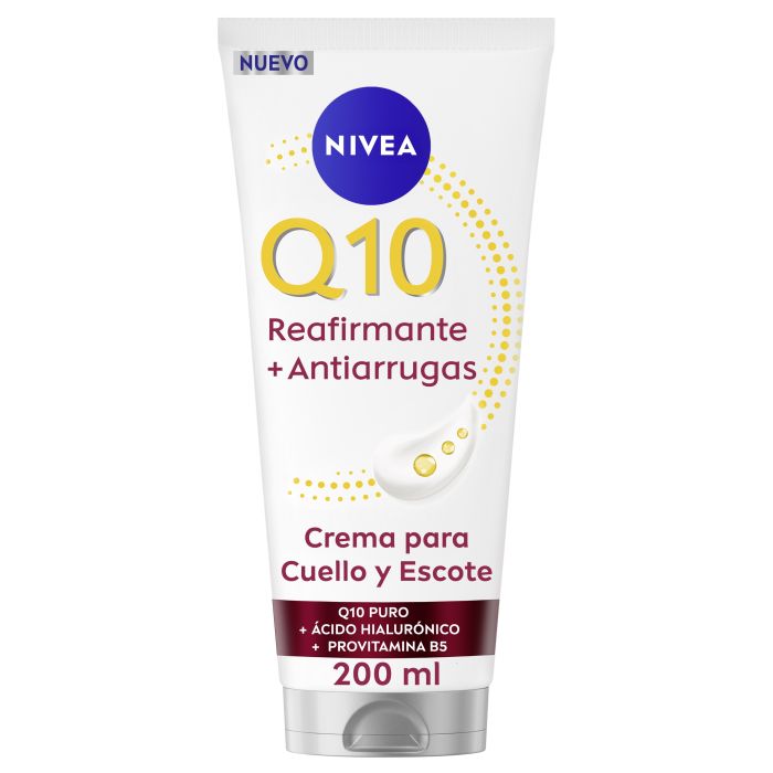 La Q10 Crema Reafirmante Antiarrugas Cuello y Escote de NIVEA está formulada para cuidar la piel sensible del cuello y el escote. Incorpora Q10 puro, creatina y provitamina B5, ingredientes que contribuyen a reducir la apariencia de líneas finas y arrugas, además de favorecer una mayor elasticidad en la piel.