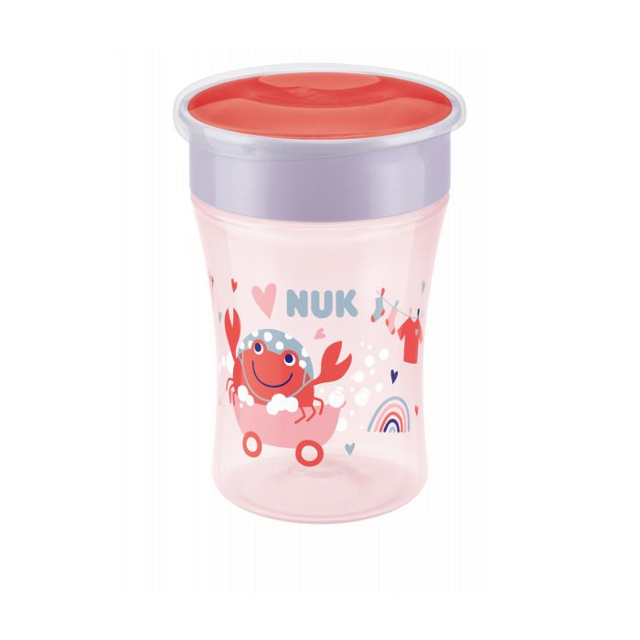 NUK Mini Magic Cup +8m es un vaso “mágico” a prueba de derrames gracias a un disco de silicona que garantiza un sellado perfecto. Tiene asas ergonómicas, una tapa transparente para su máxima protección e higiene y un borde de 360º para beber cómodamente.