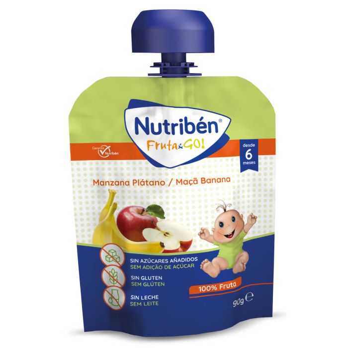 Fruta & Go Manzana y Plátano de Nutribén gracias a su cómodo formato, fácil de manejar y con tapón de seguridad podrás llevártelo a todos lados. Específico para bebés a partir de los 6 meses.