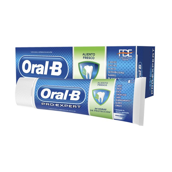 ORAL-B Pro-Expert Pasta de Dientes Aliento Fresco protege y actúa sobre caries, placa, problemas de las encías, sensibilidad, manchas, mal aliento, sarro y erosión del esmalte.