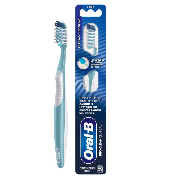 El cepillo de dientes manual ORAL-B Pro-Clean Clinical ofrece una limpieza profunda desde todos los ángulos y ayuda a eliminar la placa bacteriana, creando una fuerte protección anticaries. Sus filamentos multisuperficie, combinados con puntas PowerTip y un limpiador de lengua integrado, permiten una limpieza completa incluso en las zonas más difíciles, como detrás de los molares.