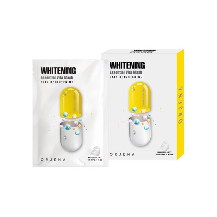 ORJENA Whitening Essential Vita Mascarilla es una mascarilla blanqueadora de alta eficacia con hoja de celulosa. Vitamina C, E, B5, B6 y Niacinamida, ayuda a proporcionar luminosidad a una piel oscura y apagada, ya sea que tenga piel sensible o acné.