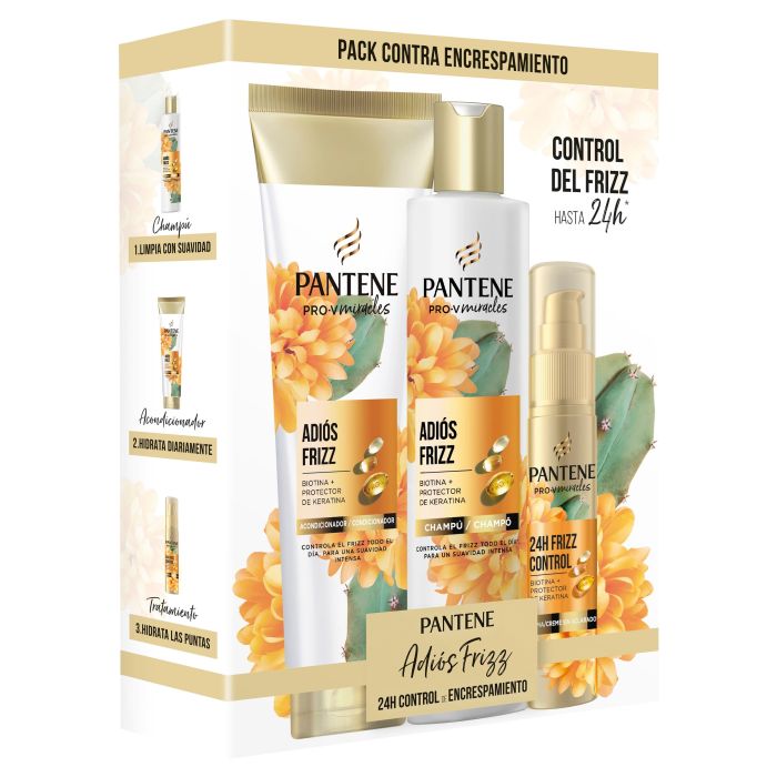 El Pack Control del Frizz incluye un champú de 250 ml, un acondicionador de 160 ml y un sérum de 70 ml, formulados con biotina y complejo keratina. Gracias a su composición, el Pack Control del Frizz de PANTENE es adecuado para cabellos secos y dañados, ayudando a mantener el cabello más manejable.
