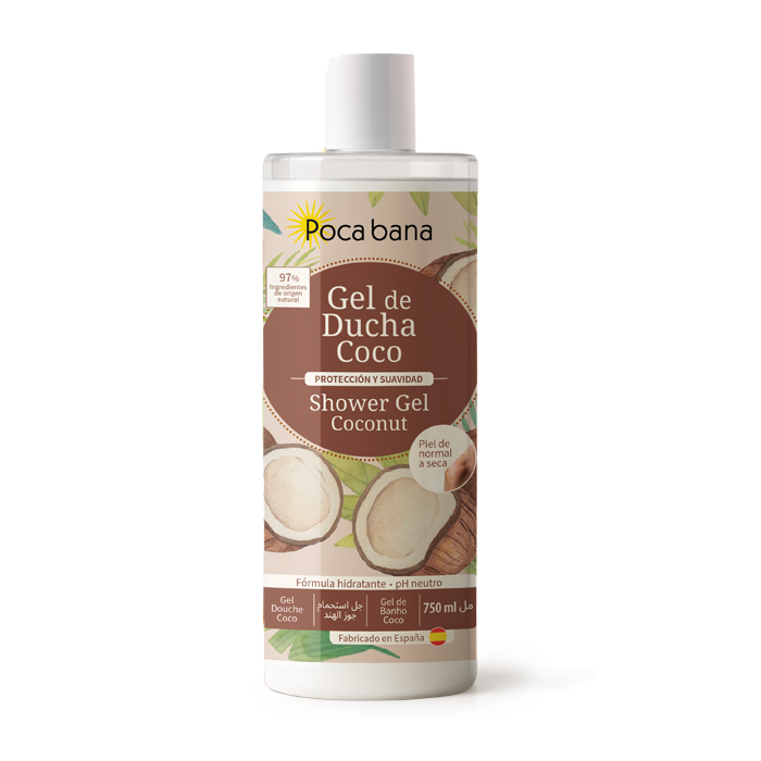 El Gel de Ducha Coco de Poca Bana limpia suavemente la piel mientras la nutre y la protege, gracias a su fórmula con 98 % de ingredientes naturales, sin sulfatos ni parabenos.