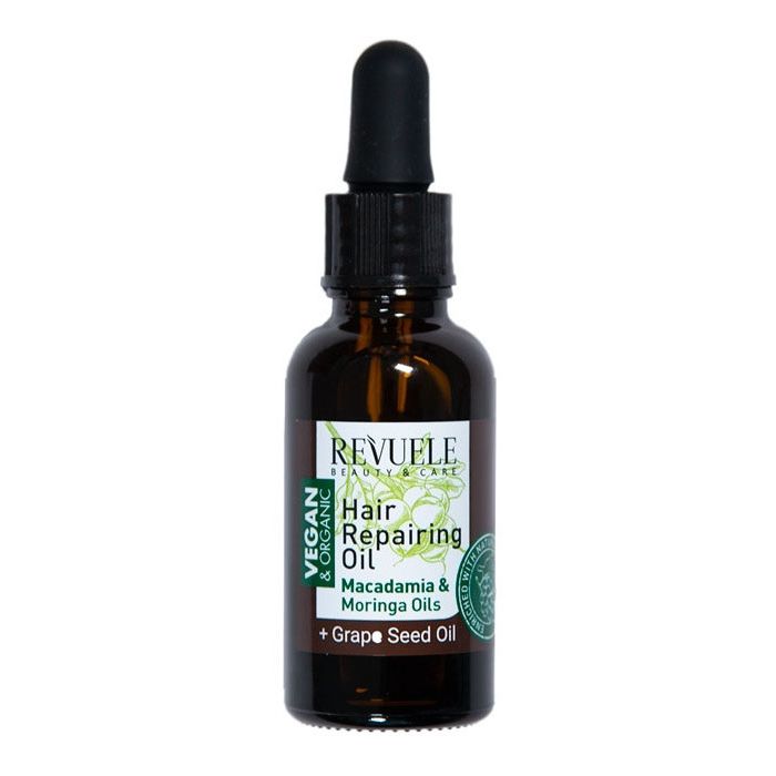 Aceite Capilar Reparador Macadamia & Moringa Oils de Revuele: Este aceite capilar reparador, enriquecido con Macadamia natural, moringa y aceite de semillas de uva nutre profundamente y fortalece el cabello hasta las puntas.