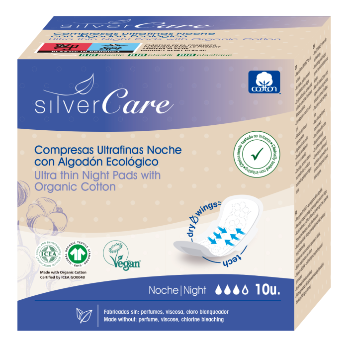 Las Compresas Ecológicas de Noche con Alas de Silver Care son ultrafinas para una mayor discreción, con alas protectoras y envasadas individualmente.Contienen una lámina impermeable y sobre individual biodegradables. Libres de perfumes y superabsorbentes y libres de plástico en contacto con tu piel.
