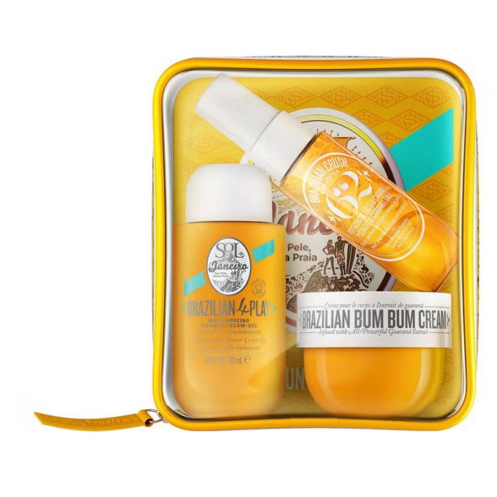 El Bum Bum Jet Set de Rutina Corporal contiene la Brazilian Bum Bum Cream de 50 ml, la Brazilian 4 Play Crema-Gel de Ducha de 90 ml y la Brazilian Crush Body Fragrance Mist de 30 ml. Cada elemento del Bum Bum Jet Set de Rutina Corporal aporta la fragancia distintiva de SOL DE JANEIRO, ofreciendo una experiencia completa de cuidado corporal.