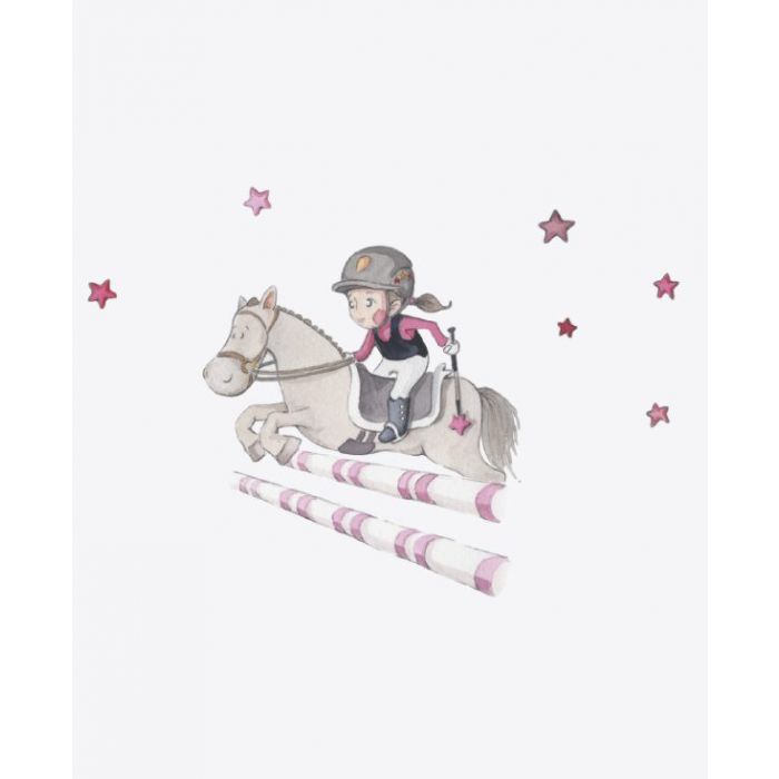 Alegre reproducción de dibujo en acuarela pintada a mano de niña amazona saltando con su caballo rodeada de estrellas rosas. Reproducción de dibujo pintado a mano en vinilo 100 µm recortado autoadhesivo de alta calidad y fácil colocación, impreso en tintas látex no tóxicas de alta resistencia, con acabado mate.
