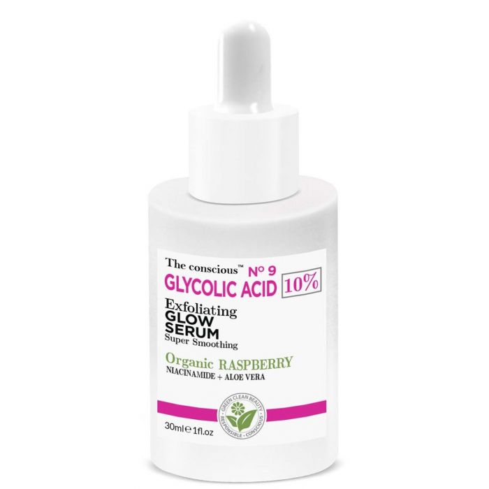 El Serum Exfoliante con Ácido Glicólico  de The Conscious™ es un serum facial de noche transformador de la piel enriquecido con Ácido Glicólico exfoliante, Niacinamida y Hojas de Frambuesa Orgánica. Ayuda a eliminar las células muertas acumuladas y los poros, para reducir la apariencia de los signos del envejecimiento.